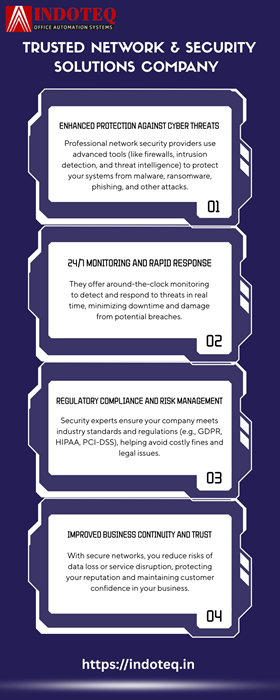 Indoteq offers end-to-end network infrastructure and IT security services across India, including LAN/WAN, wireless, structured cabling, firewalls, VPNs and managed network security — designed to protect your business assets and enable secure, efficient communication. Visit https://indoteq.in/security-solutions for a full solution-suite. ![]() | |