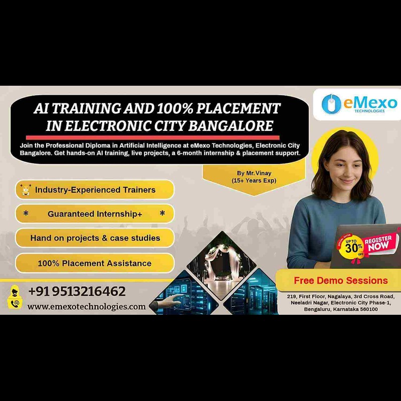 Business Name: eMexo Technologies Service Offered: AI Training in Electronic City Bangalore Description: eMexo Technologies is a leading AI Training Institute in Electronic City Bangalore, offering hands-on and industry-focused Artificial Intelligence training. Our AI Course in Electronic City Bangalore covers essential AI concepts including Machine Learning, Deep Learning, Neural Networks, Natural Language Processing (NLP), and Generative AI. We provide flexible classroom and online training options, real-world project experience, and expert mentorship from industry professionals. Recognized as one of the Best AI Training in Electronic City Bangalore, we also offer 100% placement assistance through our AI Training and Placement in Electronic City Bangalore. If you're looking for a trusted AI Training Center in Electronic City Bangalore, eMexo Technologies is your ideal destination. Courses Offered: AI Certification Course in Electronic City Bangalore Machine Learning & Deep Learning Generative AI & NLP Real-Time Project Training Placement Assistance Mode of Training: Classroom & Online ![]() | |