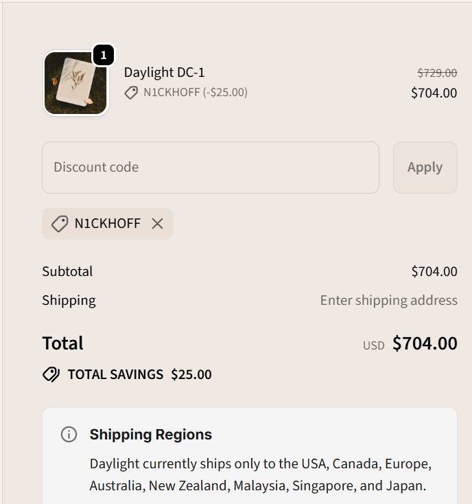 Use coupon code: N1CKHOFF at checkout to get $25 off your order now from Daylight. ![]() | |