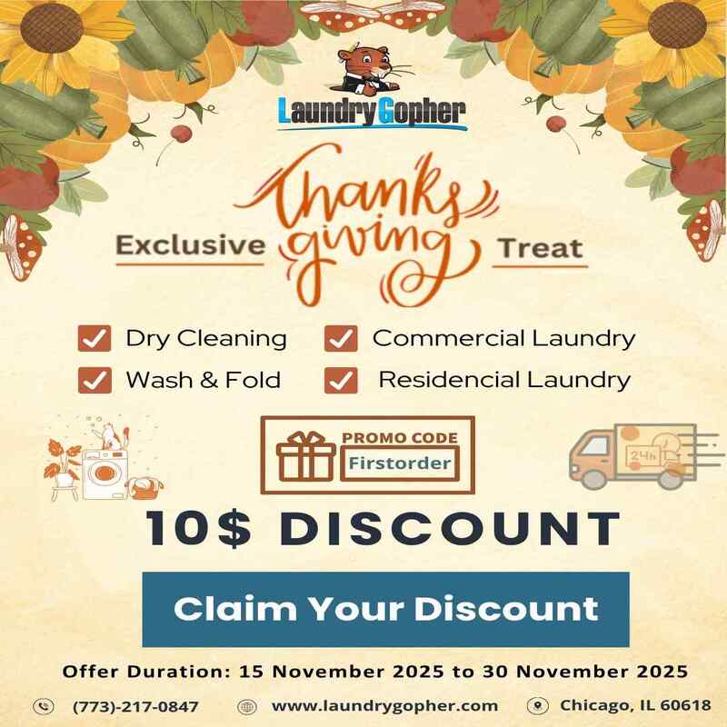Celebrate Thanksgiving with spotless laundry! Laundry Gopher is offering a $10 discount on all services, including dry cleaning, wash & fold, commercial laundry, and residential laundry. Enjoy fast turnaround, quality cleaning, and convenient pickup & delivery anywhere in Chicago. Offer Valid 15 November 2025 to 30 November 2025. Limited-time holiday deal—book now at LaundryGopher.com and save on your next laundry order! ![]() | |