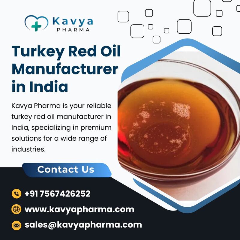 Kavya Pharma is a major turkey red oil manufacturer in India and has a reputation for manufacturing premium-quality products to meet international quality and safety standards. Our advanced manufacturing technology and expert team guarantee that every batch is processed under strict quality control to maintain consistency, purity, and effectiveness. We specialize in supplying Turkey Red Oil for various applications in textiles, cosmetics, agriculture, and pharmaceuticals. Our commitment to innovation, quality, and customer satisfaction has earned the trust of clients around the world. Get in touch with us for superior quality, reliable supply, and outstanding service. Our Services: Speciality Chemicals Turkey Red Oil Castor Oil Tolu hydroquinone (THQ) manufacturers Trypan Blue Ophthalmic Solution Manufacturers Gadodiamide 10 mL injection Sulphonated castor oil TRO Sulphonated Castor Oil 2,3-Lutidine manufacturers For More Information: Call: +91 7567426252 Address: Kavya Pharma, Shop No.215,Raj Mandir Complex, Aai Mata Road,Parvat Patiya, Surat, Gujarat-395010 Email: sales@kavyapharma.com Website: https://www.kavyapharma.com ![]() | |