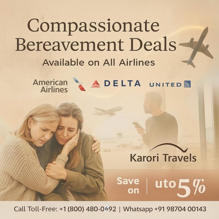 Karori Travels offers compassionate Bereavement Discounts on all airline flights within the U.S. Travel with ease and care when it matters most. Bereavement Discounts Available Call Toll-Free: +1 (800) 480-0692 | WhatsApp: +91 98704 00143 ![]() | |