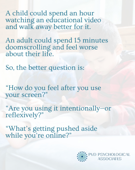 Continuing on the subject on screen time How Many Hours Is Too Many? The most common question we hear is, “How many hours is too many?” Honestly, it depends. A child could spend an hour watching an educational video and walk away better for it. An adult could spend 15 minutes doomscrolling and feel worse about their life. So, the better question is: “How do you feel after you use your screen?” “Are you using it intentionally—or reflexively?” “What’s getting pushed aside while you’re online?” That’s where the conversation shifts from time management to mental health. ![]() | |