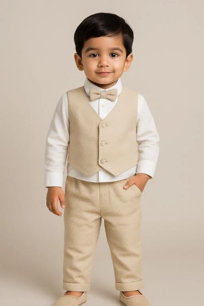 Turn special occasions into picture-perfect moments with this beige waistcoat set, complete with a crisp shirt, coordinating trousers, and a matching bow tie. Tailored for weddings, birthdays, and every dapper celebration. ![]() | |