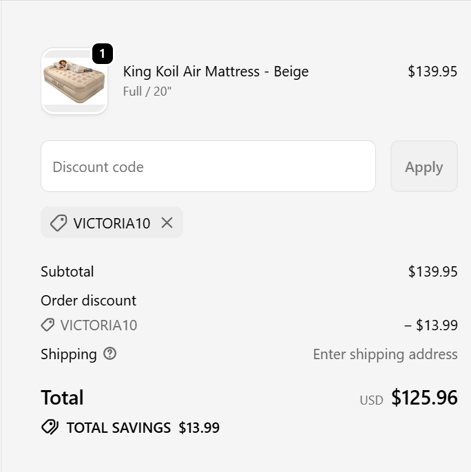 Use promo code: VICTORIA10 at checkout to save 10% off your purchase from King Koil Airbeds. ![]() | |