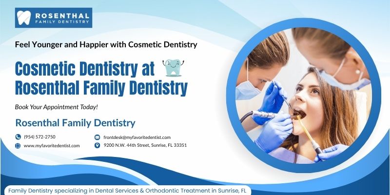 Feel Younger and Happier with Cosmetic Dentistry Your smile is one of the first things people notice—make it unforgettable! At Rosenthal Family Dentistry, we specialize in cosmetic dentistry treatments designed to enhance, restore, and transform your smile. With our personalized care, you’ll feel younger, happier, and ready to shine every day. Why Choose Cosmetic Dentistry? - Fix chipped, stained, or uneven teeth for a flawless look - Boost self-confidence in both personal and professional life - Improve function while enhancing natural beauty Benefits of Our Services ✔ Personalized plans tailored to your smile goals ✔ Advanced technology for safe, comfortable results ✔ Long-lasting improvements for both beauty & dental health Why Rosenthal Family Dentistry? - Skilled dentists with years of cosmetic expertise - Warm, patient-focused environment - Trusted by the community for quality care & stunning smile makeovers ✨ Transform your smile today—schedule your cosmetic dentistry consultation and love the way you look! - (954) 572-2750 - 9200 N.W. 44th Street, Sunrise, FL 33351 ✉ frontdesk@myfavoritedentist.com ![]() | |