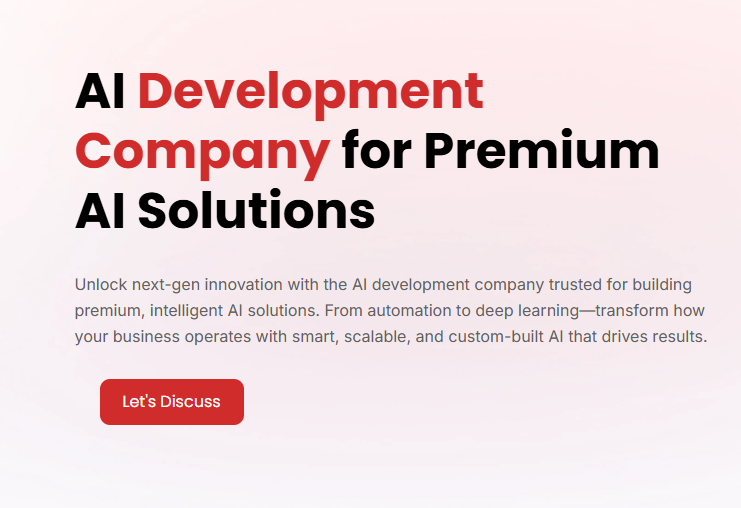 --> Hire a Top AI Development Company and Turn Innovation into Impact Looking to integrate Artificial Intelligence into your business? Our AI development experts design and build intelligent, data-driven solutions that boost efficiency, automate workflows, and unlock new growth opportunities. We specialize in: Custom AI and Machine Learning solutions Predictive analytics and data modeling Natural Language Processing (NLP) and computer vision AI-powered chatbots and automation tools End-to-end AI strategy, development, and deployment --> Why Choose Us? Experienced data scientists and AI engineers Proven track record across industries Scalable engagement models — from MVP to enterprise AI Transparent processes and fast delivery Transform your ideas into intelligent solutions. --> Partner with our AI Development Company today and shape the future of your business! ![]() | |