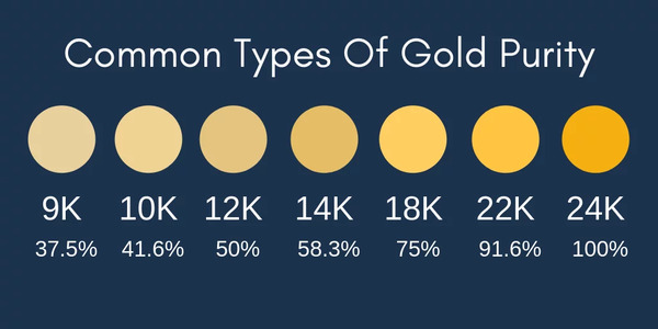 The Main Differences between 24K, 18K, 14K, and 10K gold are Gold Purity, Durability, Color, and Cost: ![]() | |